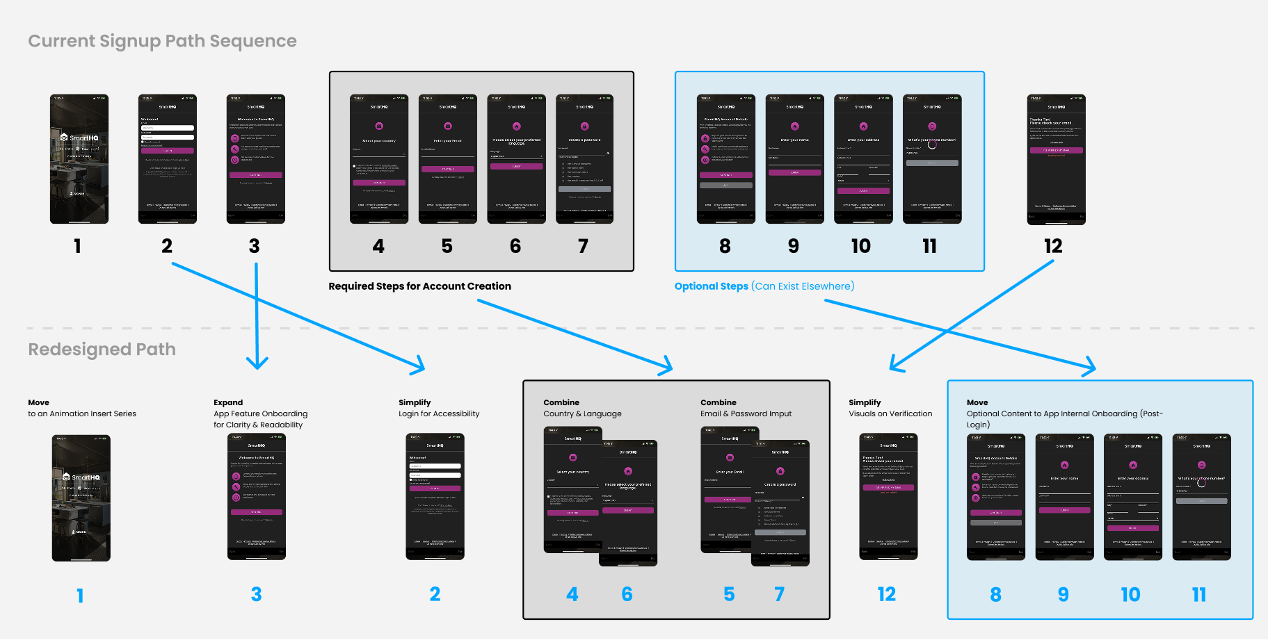 Rather than treating onboarding as a series of isolated UI screens, I approached it as a system-level experience that begins before a user ever opens the app. Early exploration focused on understanding how users discover SmartHQ, what language they associate with it, and how those expectations carry into first-time use. Given the scope of my role and the maturity of the platform, this work was positioned as a strategic proposal rather than a prescriptive mandate.